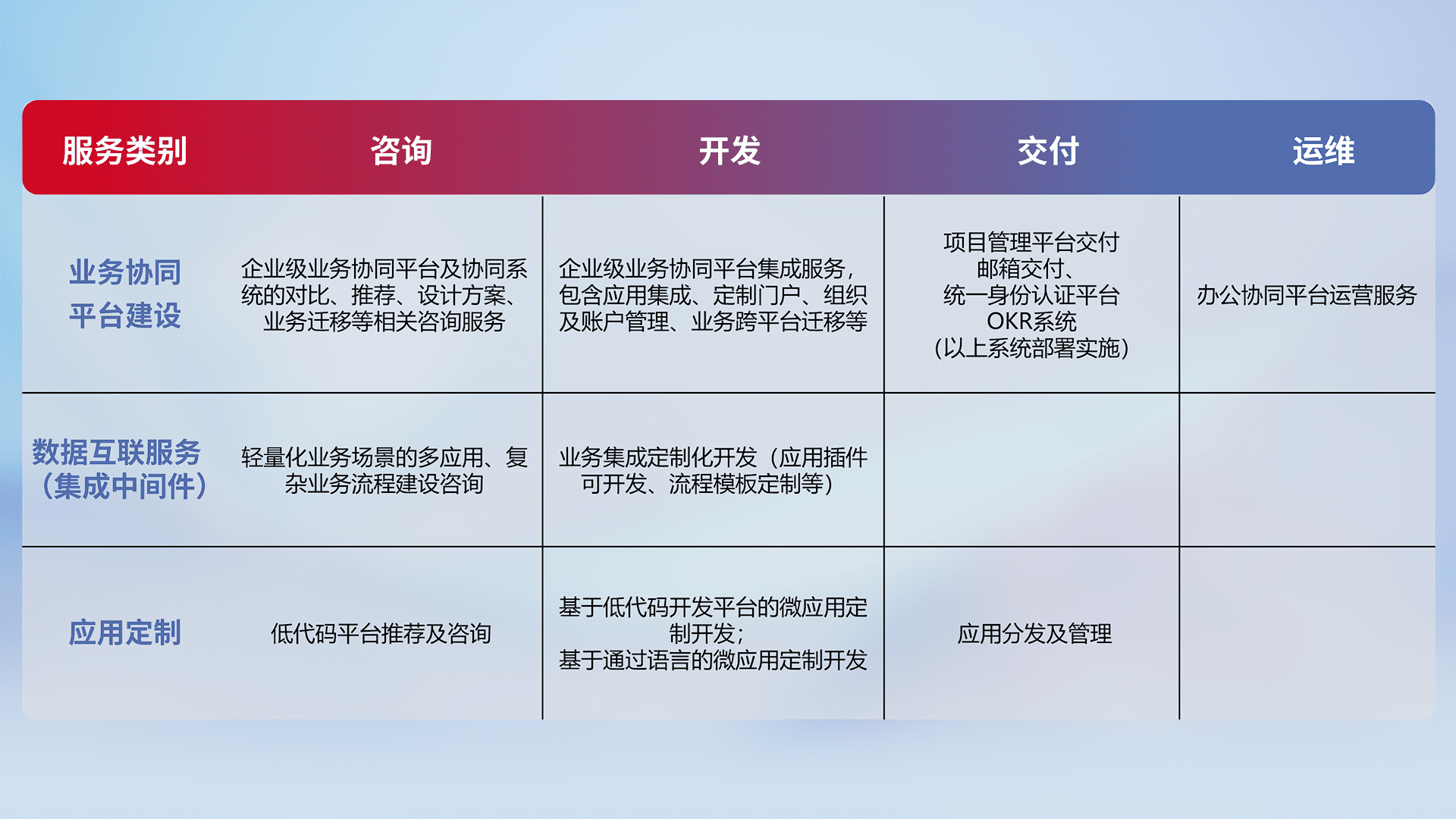 针对钉钉、、企微、、、IDaas等平台级产品提供产品的规划、、、方案、、、、交付、、、、定制化开发等服务,,,,实现如统一协同办公、、、智能客户服务、、、混合会议管理、、、智能数据查询、、、等业务场景,,,实现数字化转型。。